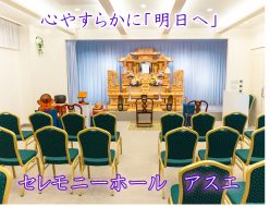 家族葬から一般葬まで心安らかに、あたたかなひと時をアスエホールでお過ごしください。「大切な方とのお別れをご家族様に寄り添ったカタチ」で心のこもったご葬儀を提供いたします。24時間対応しております。お気軽にご相談ください。