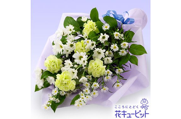 グリーンのカーネーションと白いマムが、優しく上品な印象を与える花束です。故人を偲ぶ気持ちを表現した淡いグリーンが、貴方と共にお悔みの言葉を伝えます。