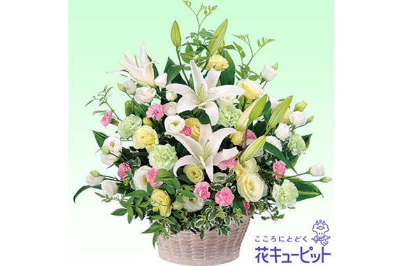 ホワイト・ピンク・グリーンを基調にした、優しい雰囲気のアレンジメントです。落ち着いた色合いの中にやわらかさが見え、優しかった故人の面影が偲ばれます。