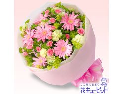 ピンクのガーベラをふんわり可愛い花束にしました。誕生日のお祝いにはもちろん、結婚記念日や退職祝いなどにも人気のフラワーギフトです。優しい気持ちや感謝の想いを伝えるときに。