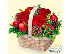 赤バラと姫リンゴを詰め込んだ、季節感たっぷりなウッドバスケットです。可愛らしくまとまったデザインで、女性やお子様へのプレゼントにおすすめです。