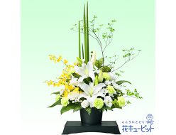 ホワイトを基調にした、故人を偲ぶ気持ちを表現したアレンジメントです。凛々しく重厚な雰囲気の中に、哀悼の意を込めています。