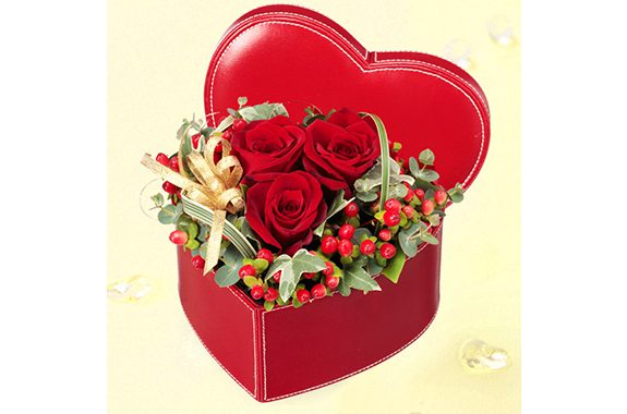 ハートボックスに赤バラを上品にアレンジしました!キュートなハート型のボックスにお花と一緒に気持ちを込めて贈りませんか?