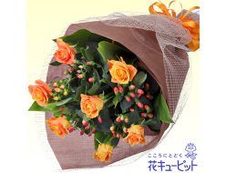 オレンジのバラがシックな印象を与える花束です。落ち着いた色合いで、世代を問わず喜ばれるでしょう。お部屋のインテリアにも馴染むスマートなデザインです。