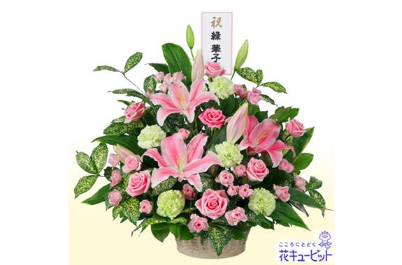 上品なピンクユリとピンクバラをあしらった、お祝いにふさわしい華やかなアレンジメントです。バスケットの中にボリューム満点にアレンジしました。