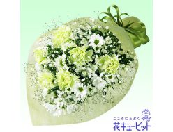 グリーンとホワイトで可愛らしくまとめた花束。追悼の気持ちを込めて。