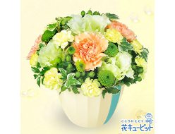 オレンジとグリーンでまとめた、清涼感たっぷりのアレンジメントです。やさしげなカーネーションとトルコキキョウが、大切な気持ちをさわやかに伝えます。