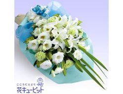 白のオリエンタル系ユリとトルコキキョウに、グリーンのカーネーションをプラスした、優しく上品な花束です。故人を偲ぶ気持ちを表現した淡いグリーンが、貴方と共にお悔みの言葉を伝えます。