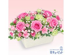 全体をピンクでまとめた愛らしいアレンジメント。ピンクバラとカーネーションなど愛らしい色合いのお花は、春のお祝いにぴったりです。
