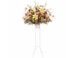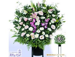 追悼の気持ちを表現したご葬儀用スタンド花です。悲しみを和らげる淡い色合いに仕上げました。※花器(スタンドなど)はレンタルです。