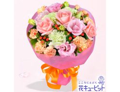 暖かな色合いのお花をフレッシュなグリーンでまとめたブーケ。花瓶がついているので届いてすぐに飾れます。