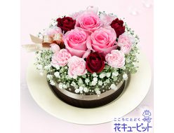 可愛いピンクのバラを使ってまるでケーキのように仕上げたフラワーギフト。誕生日・記念日の贈り物に最適です。