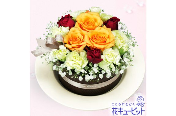 オレンジバラを使ってさわやかに仕上げたフラワーケーキ!贈られて嬉しい、飾って楽しいお花です♪