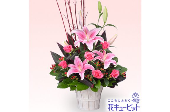 | 主な花材 | ピンクオリエンタル系ユリ、ピンクバラ |