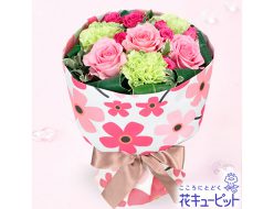 ピンクバラを中心に花々をフラワーラッピングで包み込んだブーケ。女性らしいフェミニンな雰囲気の大人の可愛らしさを持つフラワーギフトです。