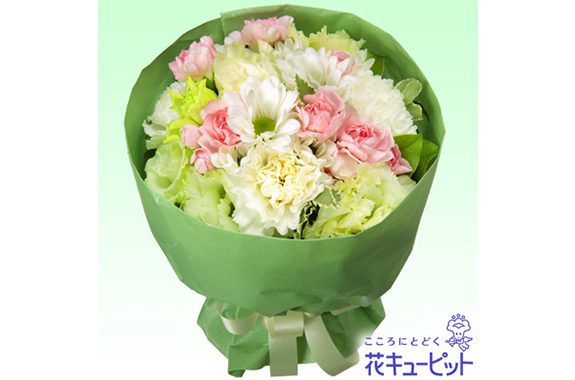 淡く清楚な色合いが亡くなったペットへの哀悼を表します。愛くるしいペットを偲んで贈る可愛らしいブーケタイプの花束です。