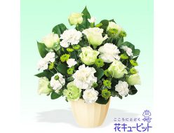 ホワイト・グリーンでまとめた涼しげな雰囲気のアレンジメントです。トルコキキョウ・カーネーションのやわらかなフォルムが、故人を偲ぶ優しい気持ちを表現しています。