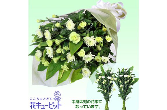 白のオリエンタル系ユリとトルコキキョウに、グリーンのカーネーションをプラスした、優しく上品な花束です。故人を偲ぶ気持ちを表現した淡いグリーンが、貴方と共にお悔みの言葉を伝えます。