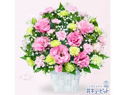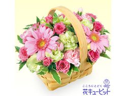 可愛らしいウッドバスケットに、ピンク色のお花をやさしくアレンジしました!