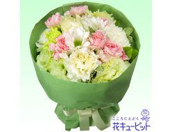 淡い色合いがやわらかい印象の花束です。お届けの時は一つに包装してお届けします。