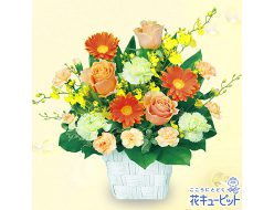 鮮やかなオレンジのバラとガーベラを、大胆にあしらったアレンジメント。伸びやかなオンシジウムを添えて、華々しいシルエットに仕上げました。あらゆるお祝いのシーンで活躍します。