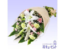 淡いピンクのユリは、やわらかくやさしい雰囲気になります。哀悼の意を込めた花束です。