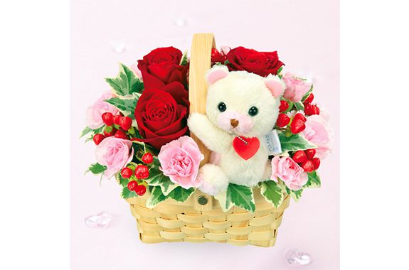 赤やピンクを基調にした、可愛らしいアレンジメントにくまのマスコットを付けてさらに愛らしく仕上げました。