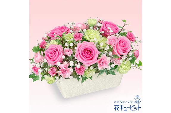 全体をピンクでまとめた愛らしいアレンジメント。ピンクバラとカーネーションなど愛らしい色合いのお花は、春のお祝いにぴったりです。
