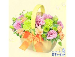 ピンクのトルコキキョウを中心に、さわやかな色合いでまとめたバスケット。明るく鮮やかなオレンジのリボンがワンポイントです。
