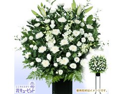 追悼の気持ちを表現したご葬儀用スタンド花です。ユリなどの白いお花をふんだんに使用して凛とした雰囲気に。お供え、ご葬儀に最適です。※花器(スタンドなど)はレンタルです。