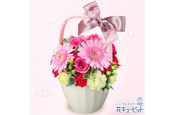感謝を伝える贈りものには、ピンク色でまとめたアレンジメントを。愛らしさ満点のガーベラとバラを中心に、やさしい色の花たちをぎゅっと詰め合わせました。