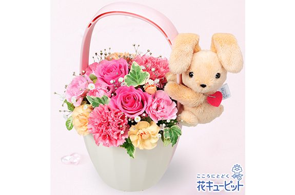 かわいらしいうさぎが、お花とともに大切な想いをお届けします。華やかなピンクバラは、どんなお祝いのシーンにもぴったり。女性やお子さまにおすすめのアレンジメントです。