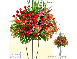 赤でまとめたスタンド花は目にも鮮やか、周りを一気に華やいだ雰囲気にしてくれます。※スタンドは変更になる場合があります。※花器(スタンドなど)はレンタルです。