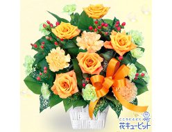 5,000円~, アレンジメント, イエローオレンジ, お祝い, お祝い, お祝い全般, お花の種類, カラー, スタイルから探す, バラ, バラ, 予算から探す, 出産祝い, 新築・引っ越し祝い, 用途から探す, 誕生日の花を探す, 誕生日フラワーギフト, 誕生日フラワーギフト一覧, 開店・開業祝いオレンジバラのアレンジメント【5,000円+税】511767