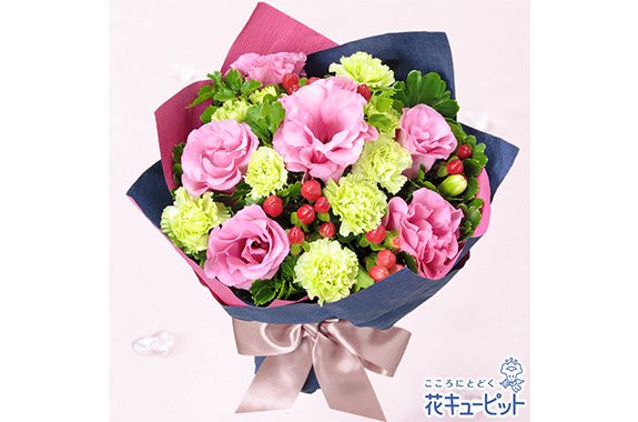 ピンクとグリーンの花がポップな印象のブーケ。シックなネイビー×鮮やかなピンクのラッピングは、年代・性別・季節を問わず贈ることができます。
