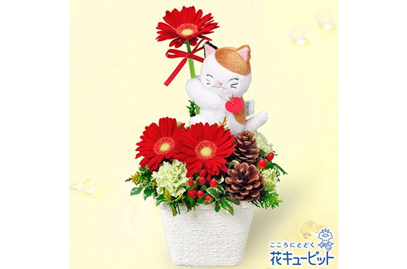 三毛猫のマスコットが冬のお花畑でにっこり♪ 赤いガーベラを差し出す姿が可愛らしいアレンジメントです。小さなお子様へのプレゼントにもぴったりです。