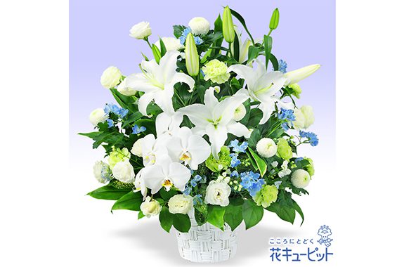 ホワイト・ブルー・グリーンのコントラストが、優しく落ち着いた雰囲気のアレンジメントです。淡いブルーの彩りが、哀惜の気持ちを表現しています。