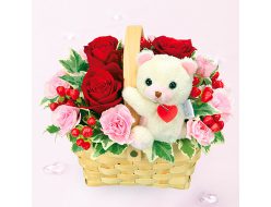 赤やピンクを基調にした、可愛らしいアレンジメントにくまのマスコットを付けてさらに愛らしく仕上げました。