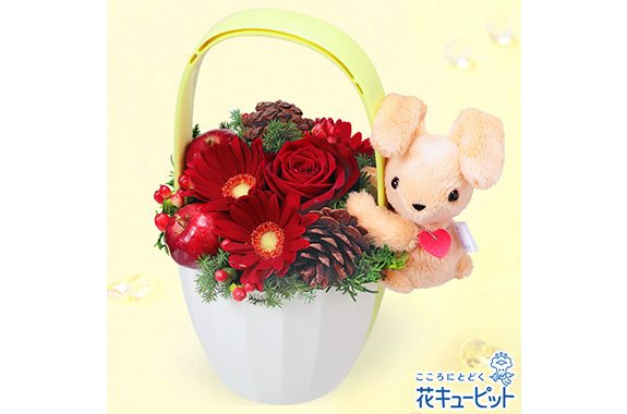 可愛らしいうさぎが、お花とともに大切な想いをお届けします。赤色でまとめたアレンジメントは、冬のギフトにぴったり。お子さまへの贈り物にもおすすめです。。