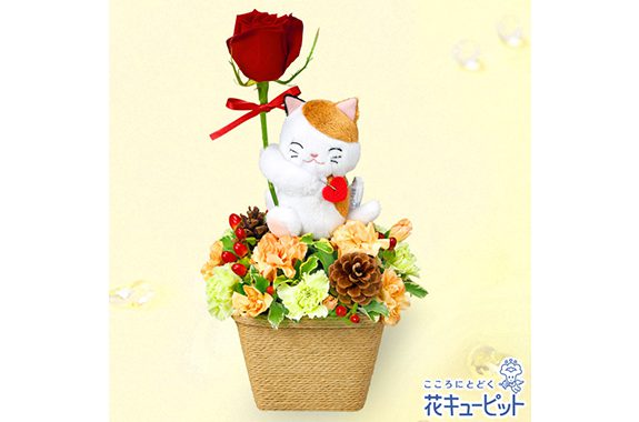 三毛猫のマスコットが冬のお花畑でにっこり♪ 赤いバラを差し出す姿が可愛らしいアレンジメントです。小さなお子さまへのプレゼントにもぴったりです。