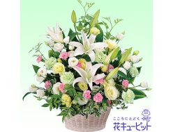 ホワイト・ピンク・グリーンを基調にした、優しい雰囲気のアレンジメントです。落ち着いた色合いの中にやわらかさが見え、優しかった故人の面影が偲ばれます。