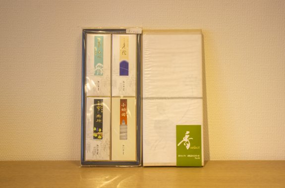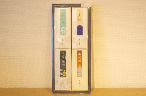 | 内容 | お線香3種(沈香香樹林・清澄香樹林・清涼光陰)+小蝋燭、化粧紙箱入り |